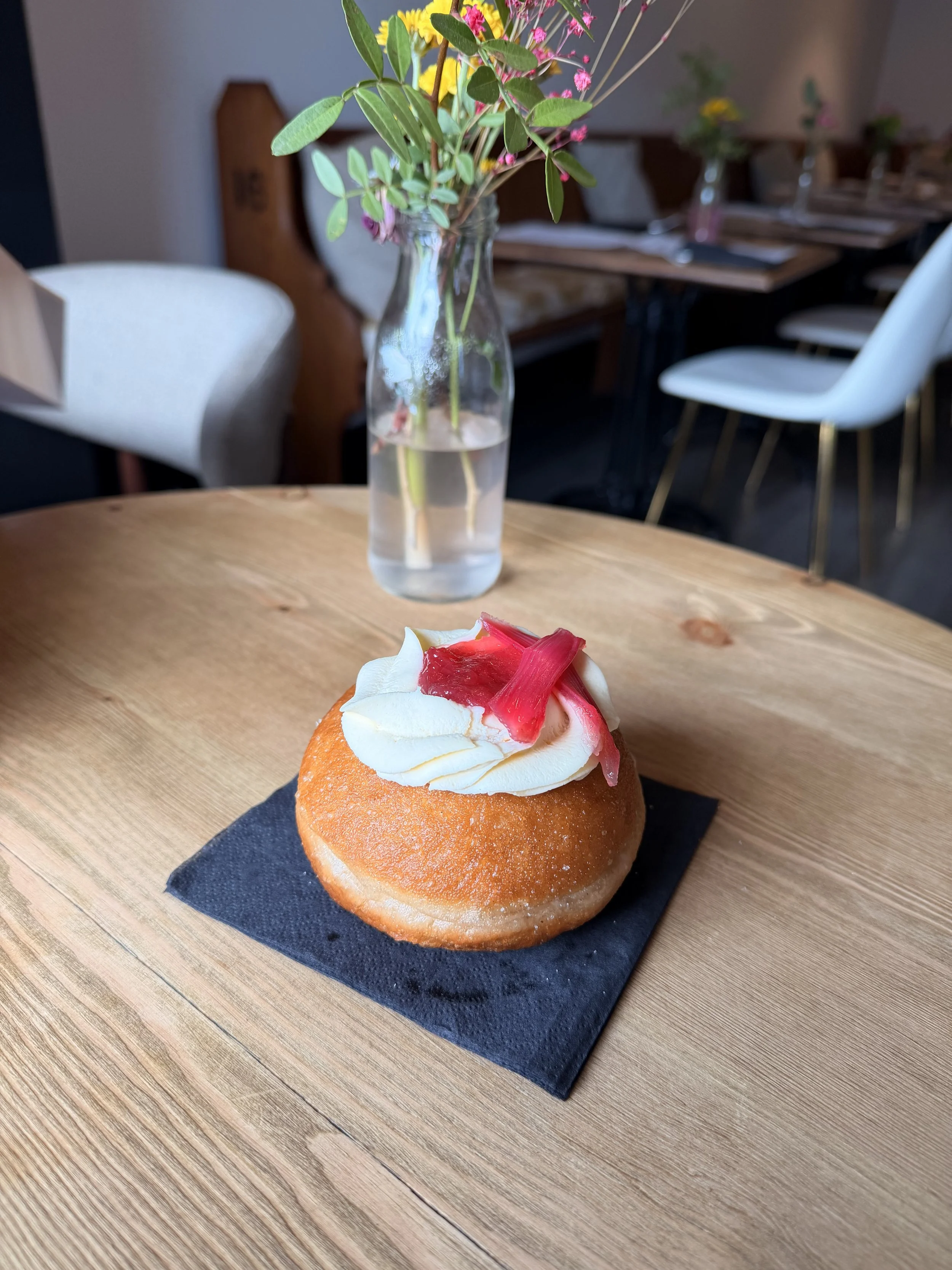 Vegan Rhubarb compote and custard filled, topped with a vanilla chantilly cream and poached rhubarb stick