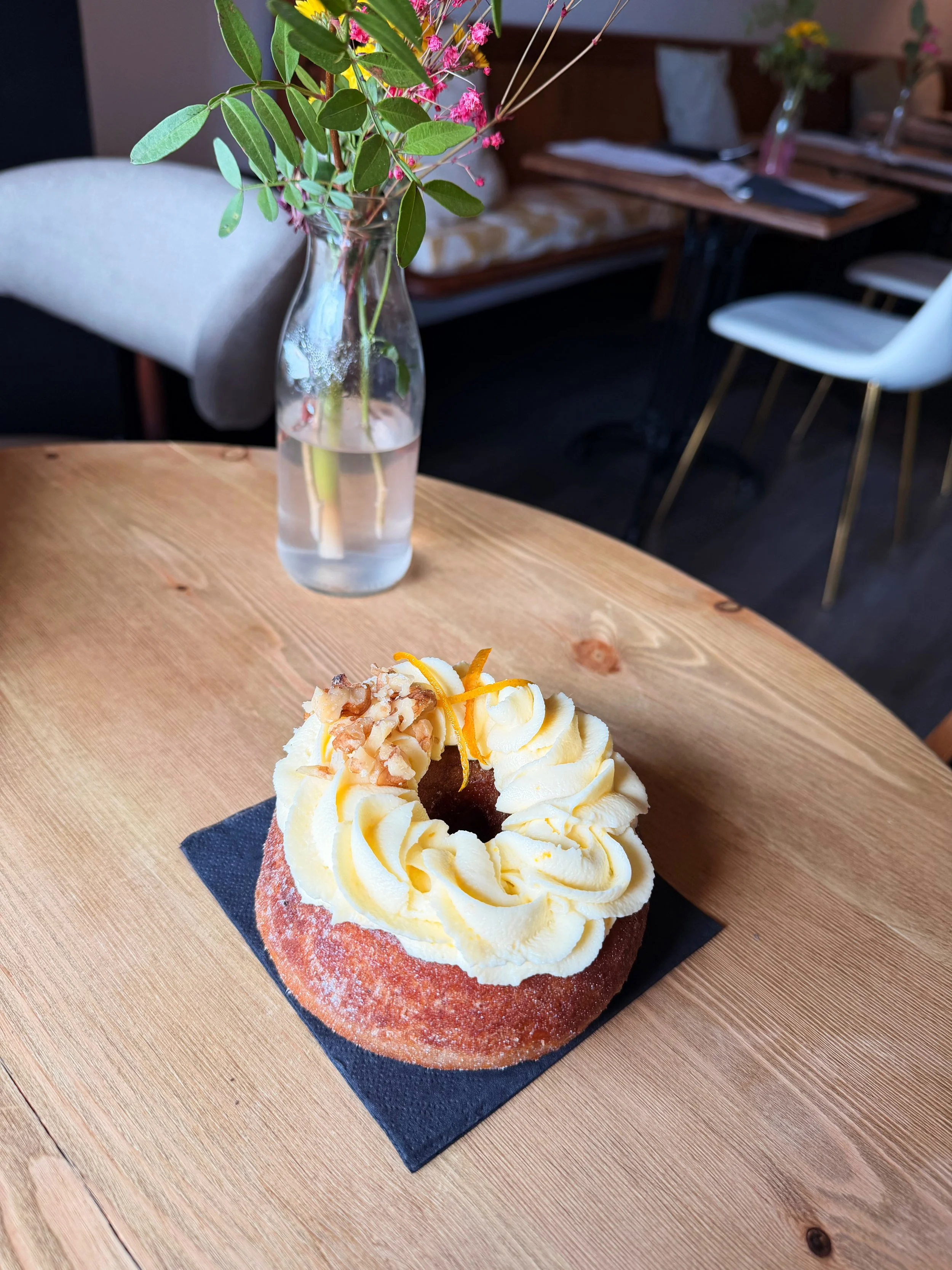 An enriched carrot cake dough, topped with a cream cheese frosting, candied orange peel and walnuts